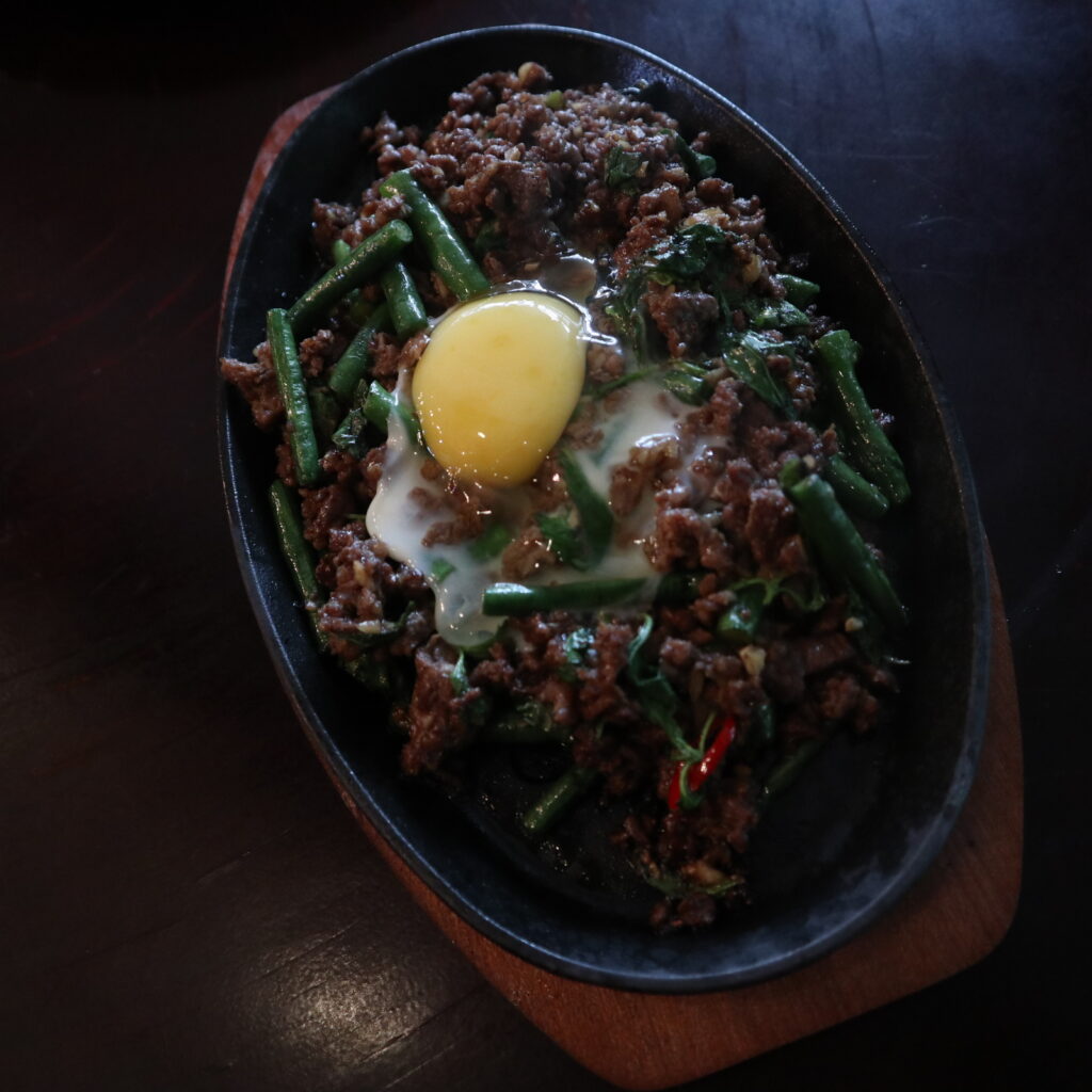 Again, the meat-eaters were all smiles and lip smacks over this dish. Long beans, chilies, basil, and egg with Wagyu beef. Chef Leo’s take on the classic Krapow, with flavors that will remind you of sisig—admittedly Chef Leo’s favorite Filipino food.