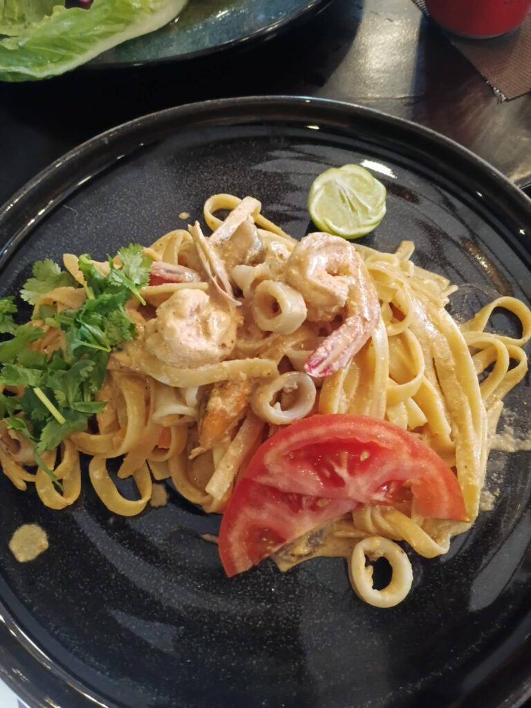 Fettuccine, prawns, squid, and mussels in a mild Tom Yum cream sauce. A Thai twist on your classic seafood pasta, velvety, flavorful, and satisfying. If you possess a purist palate, you may find this a tad too playful. But if you want to play, this is perfection. Tip: give this a generous squeeze of lime to cut the richness of the cream.