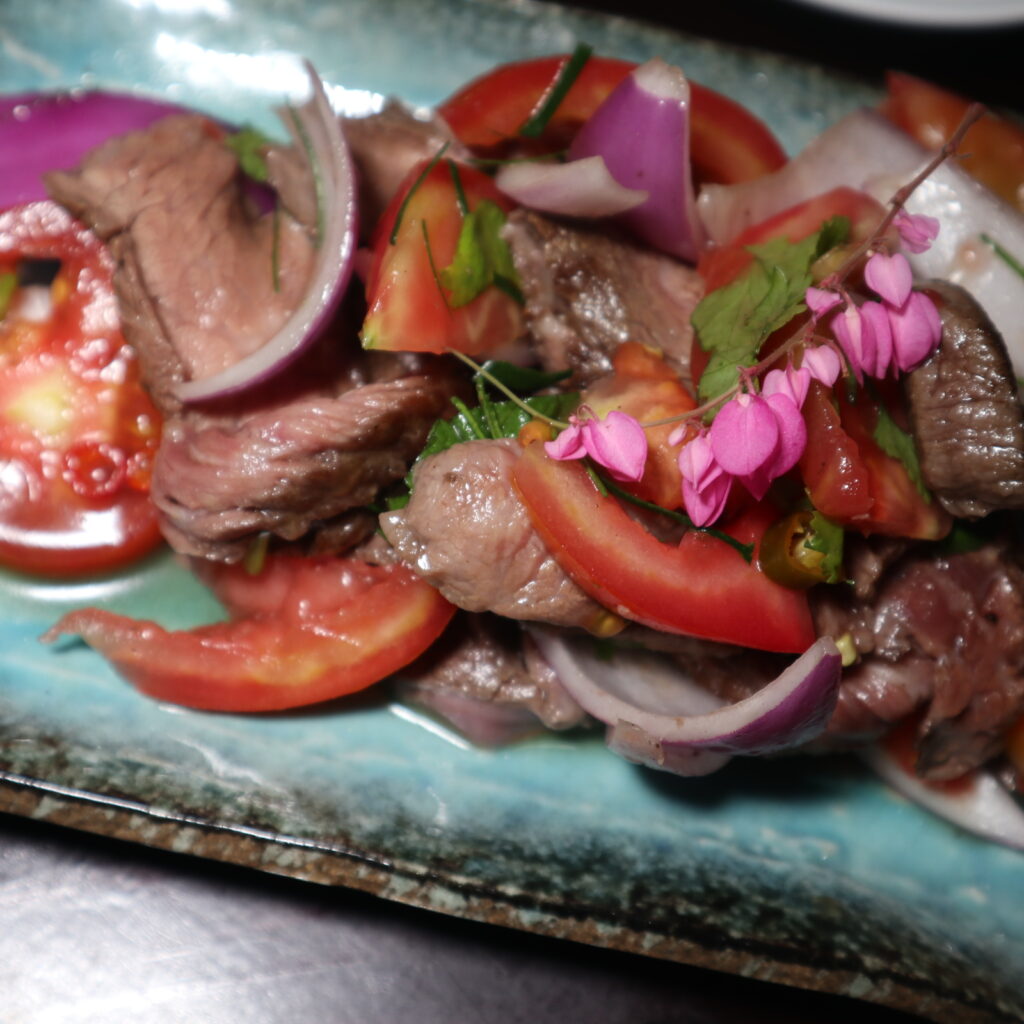 I don’t eat meat, but the carnivores at the table raved about this. Tender Wagyu beef, juicy tomatoes, onions, and Thai herbs. It’s a game-changer—a higher-end version of the traditional Thai beef salad.