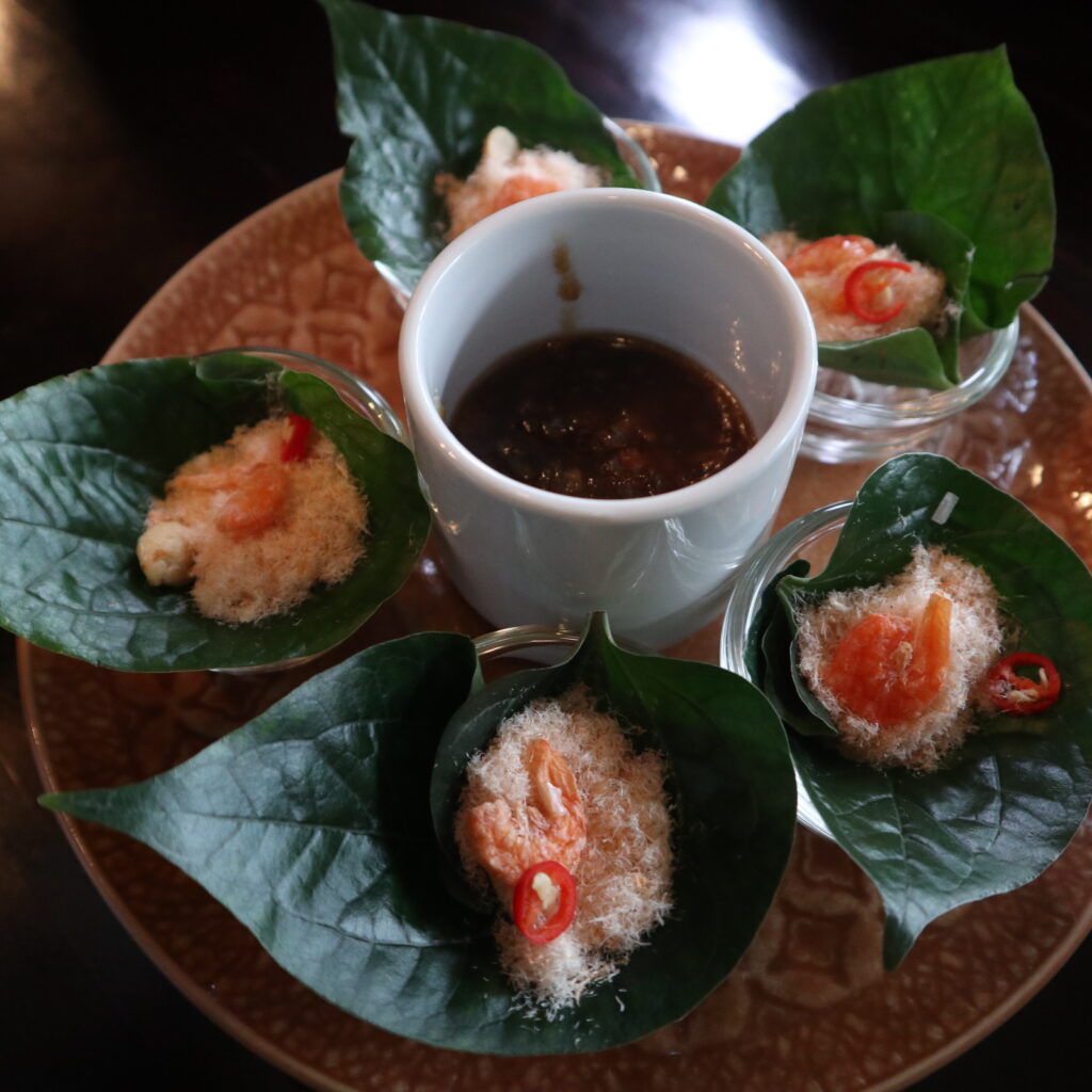 A traditional Thai snack meant for royalty! Ginger, galangal, lemongrass, red onion, peanuts, coconut, dried shrimp, chili, lime, betel leaves, and dipping sauce. The flavors explode in your mouth—fresh and crispy, like nothing you’ve had before.