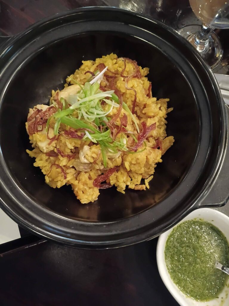 Southern-style chicken rice with curry powder, turmeric, ginger, yogurt, and a mint-ginger-chili sauce that’ll have you coming back for more. I tried a small portion of the rice, minus the chicken chunks, with a dollop of dressing. The sauce was everything—and it went well with everything. Honestly, a number of us found ourselves wishing that Chef Leo would bottle and sell the stuff.