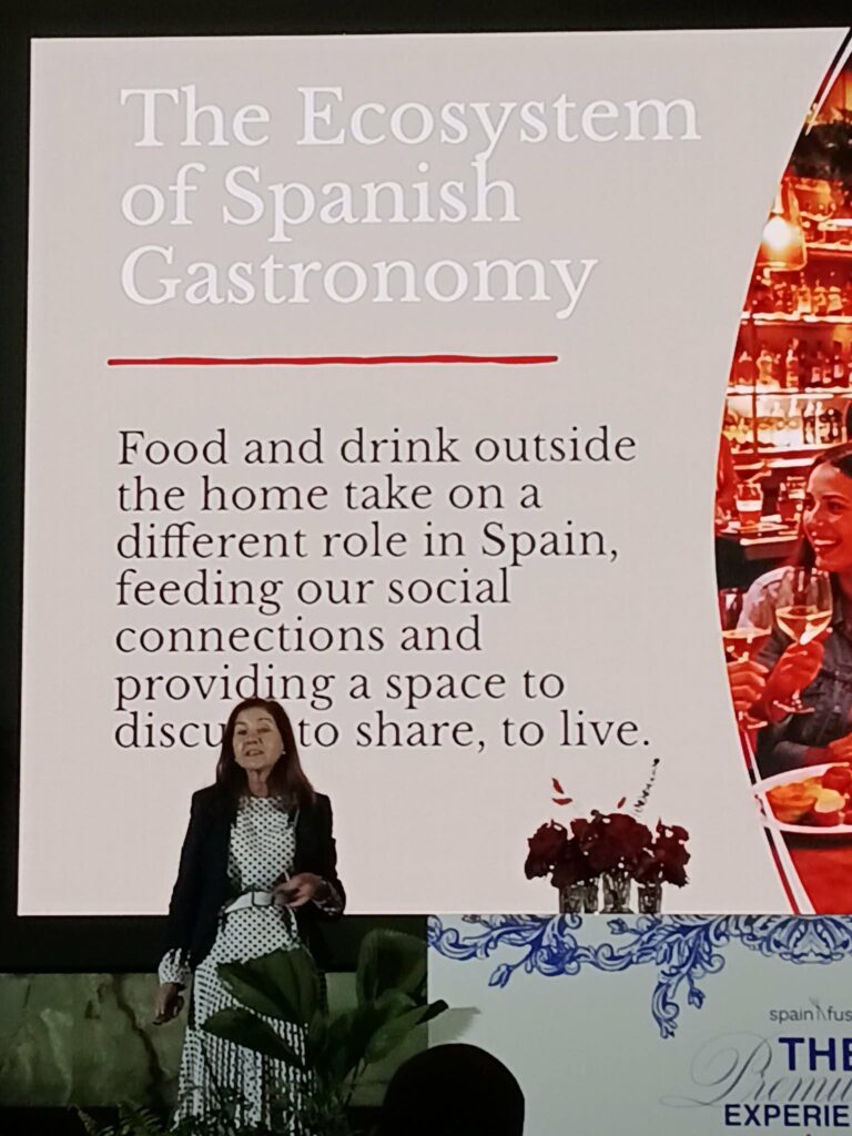 And then there was olive oil, which—if we’re being honest—deserved its own main stage. Rosa Vañó didn’t talk about olive oil like a supporting ingredient. She framed it as infrastructure. As part of Spain’s daily language. The accompanying slide made it even clearer: “The Ecosystem of Spanish Gastronomy” followed by the line, “Food and drink outside the home take on a different role in Spain, feeding our social connections and providing a space to discuss, to share, to live.” That’s the thesis right there. Not just what Spaniards eat, but how eating itself functions as social architecture.