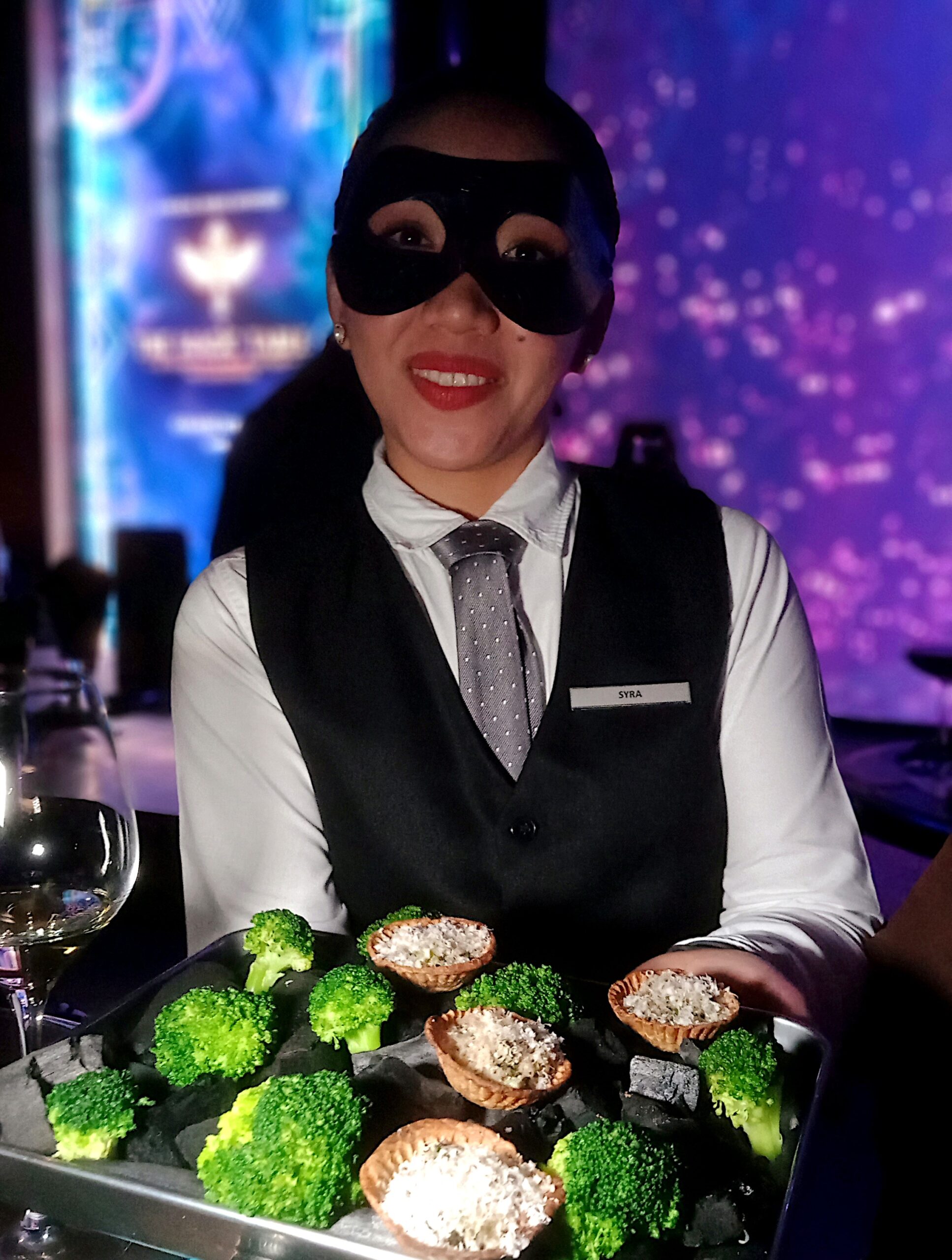 After the arrival antics, we made our way up (60 dizzying floors up, to be exact!) to the lounge at The Peak. There, the spellbinding stunts continued—with edible enchantments. Think sumptuous heavy cocktails and canapes that boggled the eyes and delighted the palate, like caviar-topped, painted marble potatoes so deceptively real they could be mistaken for actual stones, each bite a creamy, decadent surprise. Scallops floated on an exquisitely crafted bed of seashells, marrying elegant textures and oceanic freshness. Even the charred broccoli was masterfully prepared to disappear into lumps of coal—smoky, tender, and utterly unexpected (the broccoli cups, not the coal).